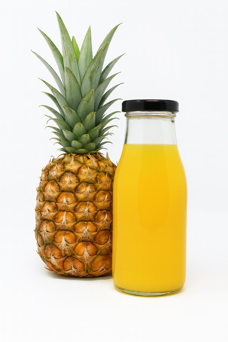 Frissen préselt 100%-ban adalék, tartósítószer, hozzáadott cukormentes ananászlé. (Lassú, kíméletes hidegen préselt eljárással készült). Fogyasztható 0-5 Celsius fokon, hűtőben tárolva a gyártástól számított 3 napig! Üzletünkben 250 ml, 500 ml és 1000 ml-es visszaváltható üvegpalackokban adjuk. Helyben is lehet fogyasztani.